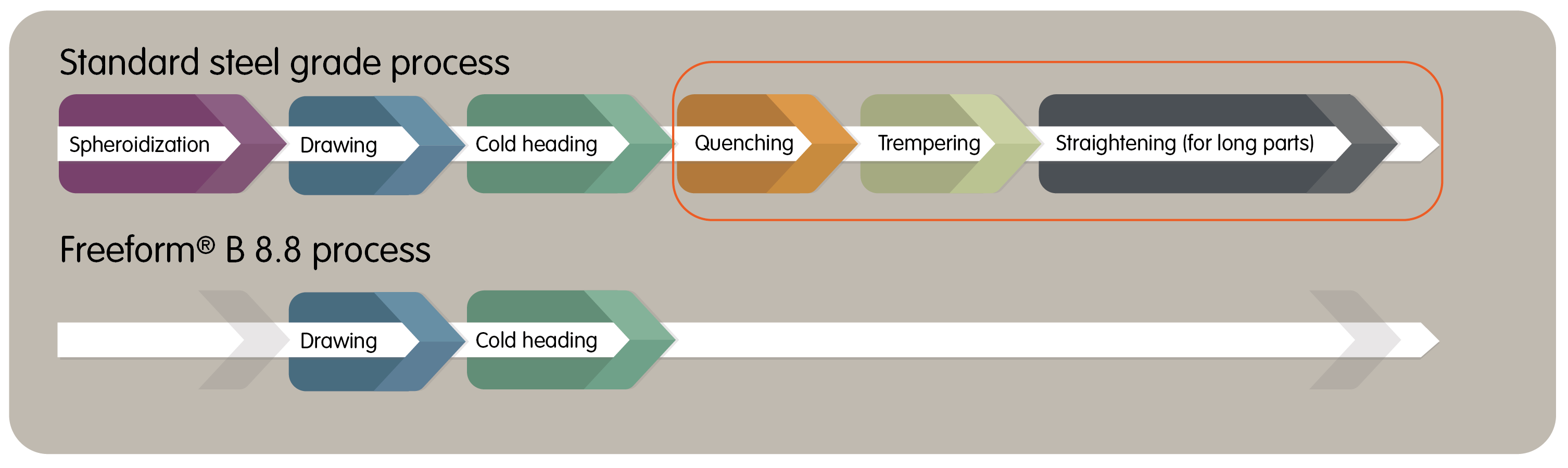 The Freeform® B family allows the production of cold heading parts that will meet the mechanical properties of classes 8.8 and 10.9 in the deformation range usually expected by customers (15% to 45%).  These grades are characterized by the absence of heat treatment in the intermediate and final phases. This makes the Freeform® B a family of steels with a lower carbon footprint and a wise environmental choice.