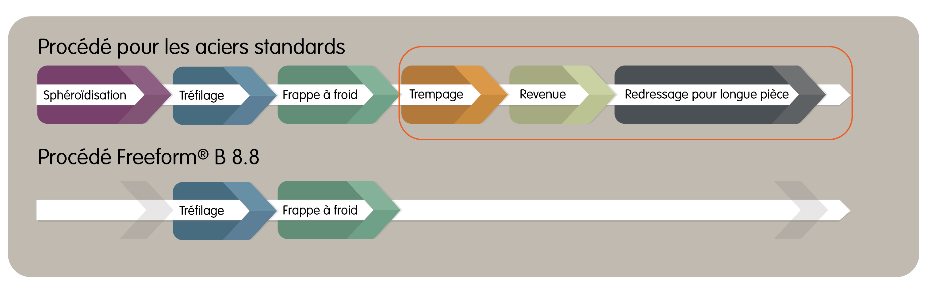 De son côté, la famille Freeform® B permette la production de pièces pour frappe à froid qui vont satisfaire les propriétés mécaniques des classes 8.8 et 10.9 dans la plage de déformation habituellement prévue par les clients (15 % à 45 %).  Ces grades se caractérisent par une absence de traitement thermique aux phases intermédiaire et finale. Cela fait des aciers de la famille Freeform® B une gamme plus faible en carbone et un choix environnemental avisé.